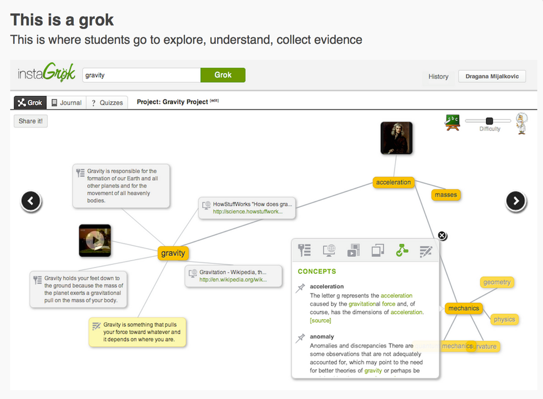 InstaGrok is an interactive search engine that allows students to search for any topic in a visually engaging way. When students conduct a search query, InstaGrok finds the relevant information related to that query and present it in the form of interactive concept maps (grok). Using InstaGrok, students will be able to explore educational content including videos and images, evaluate sources, collect evidence and use it to craft a search report.